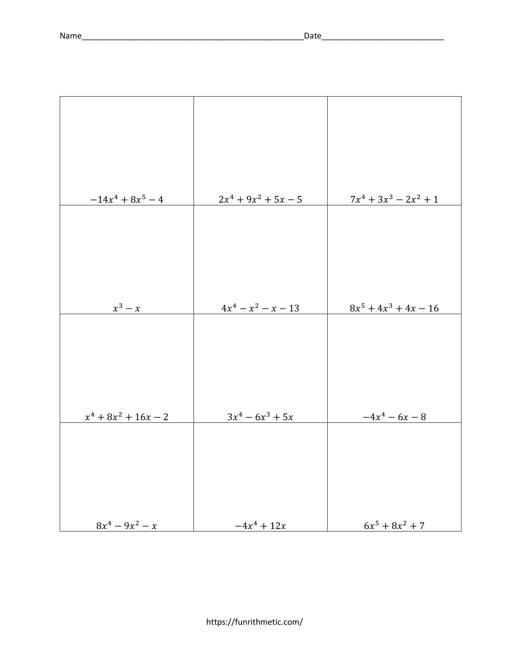 In this activity, students will add and subtract polynomials as they tap into their creative side! Once student simplify the expressions, they will locate the box with their answer in it on the next page and follow the given directions for that box. They will fill the box with fun patterns, drawings, and creative ideas! The students will create their own colorful masterpieces as they reinforce their algebra skills, and you will be able to quickly check for understanding as the students assemble their artwork. This flexible activity allows students to stretch their imagination while reinforcing important algebra concepts.