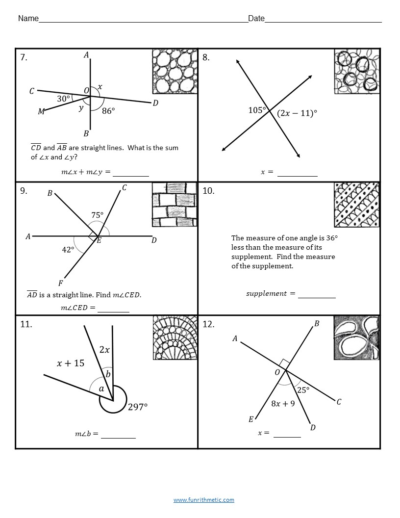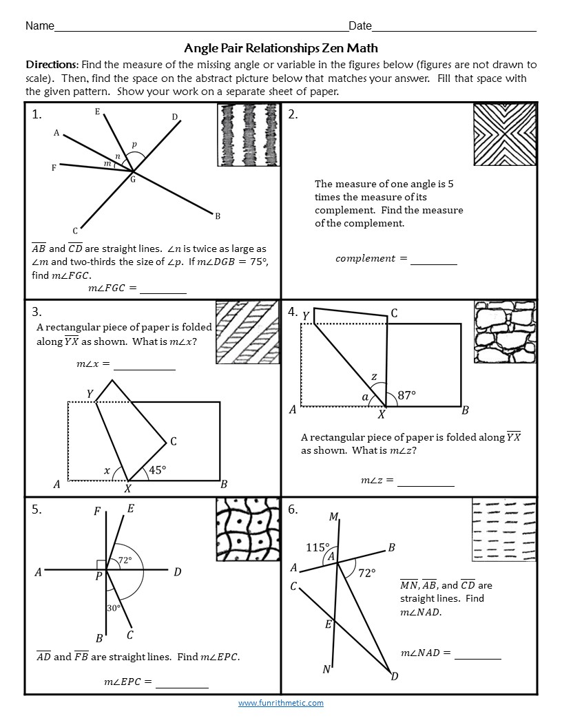 With this no-prep activity, students will find the measures of angles or variables using what they know about angle pair relationships (complementary, supplementary, vertical, linear). Then, they will find their answer on the abstract picture and fill in the space with a given pattern to reveal a beautiful, fun Zen design! Students can color their final products or leave them in black and white. Either way, your classroom will be decorated with beautiful artwork as the students practice their geometry skills!