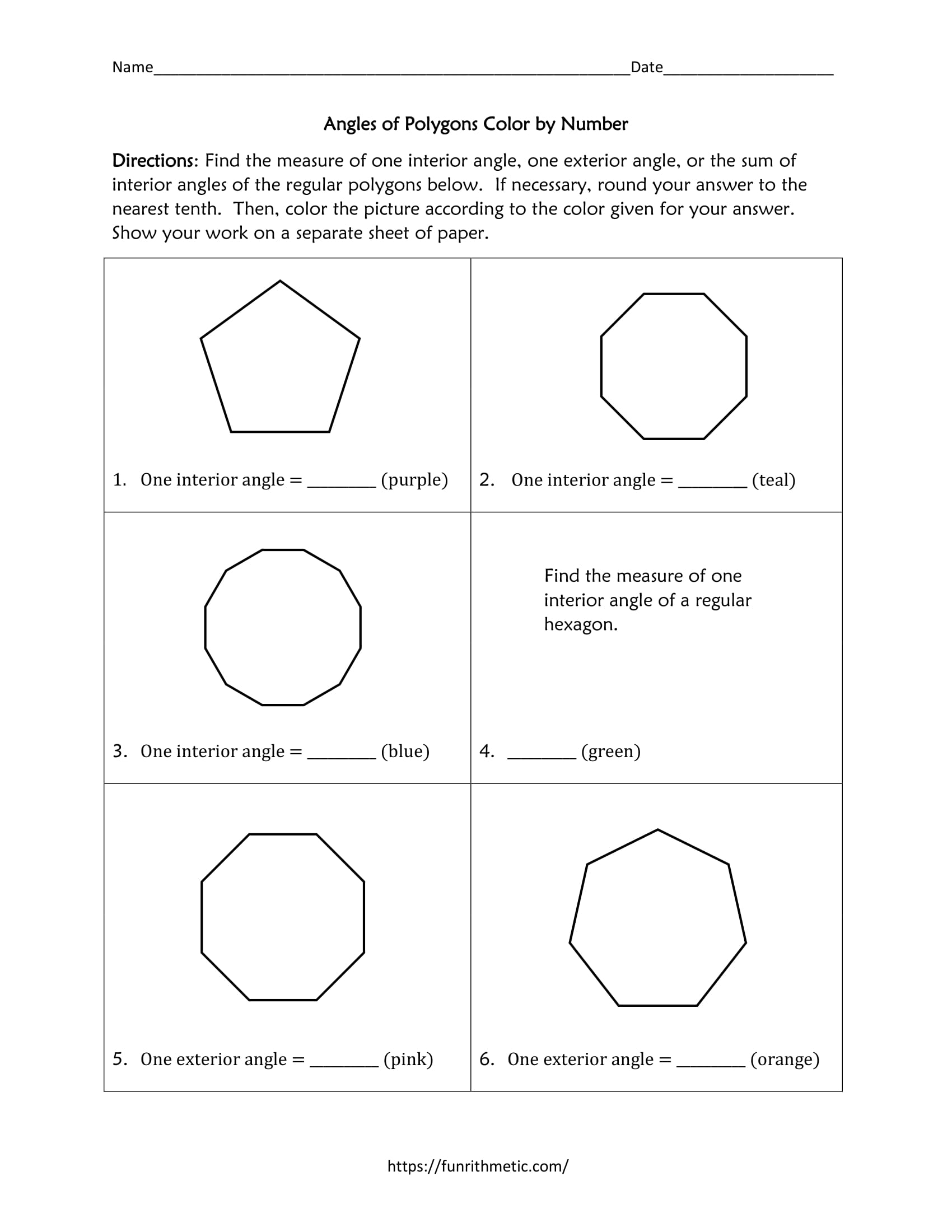 In this activity, students will practice finding the measure of interior and exterior angles and the sum of interior angles of regular polygons as they have fun coloring! Students will color their answers on the picture with the indicated color in order to reveal a beautiful, colorful pattern!