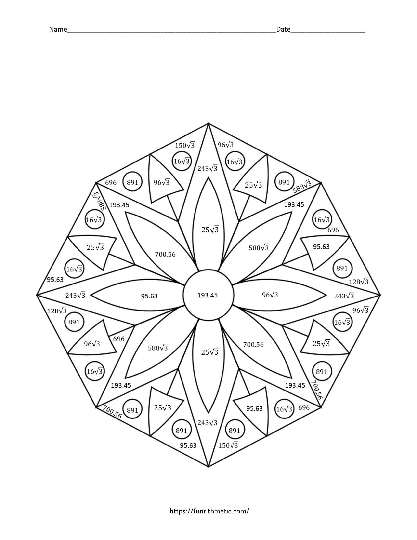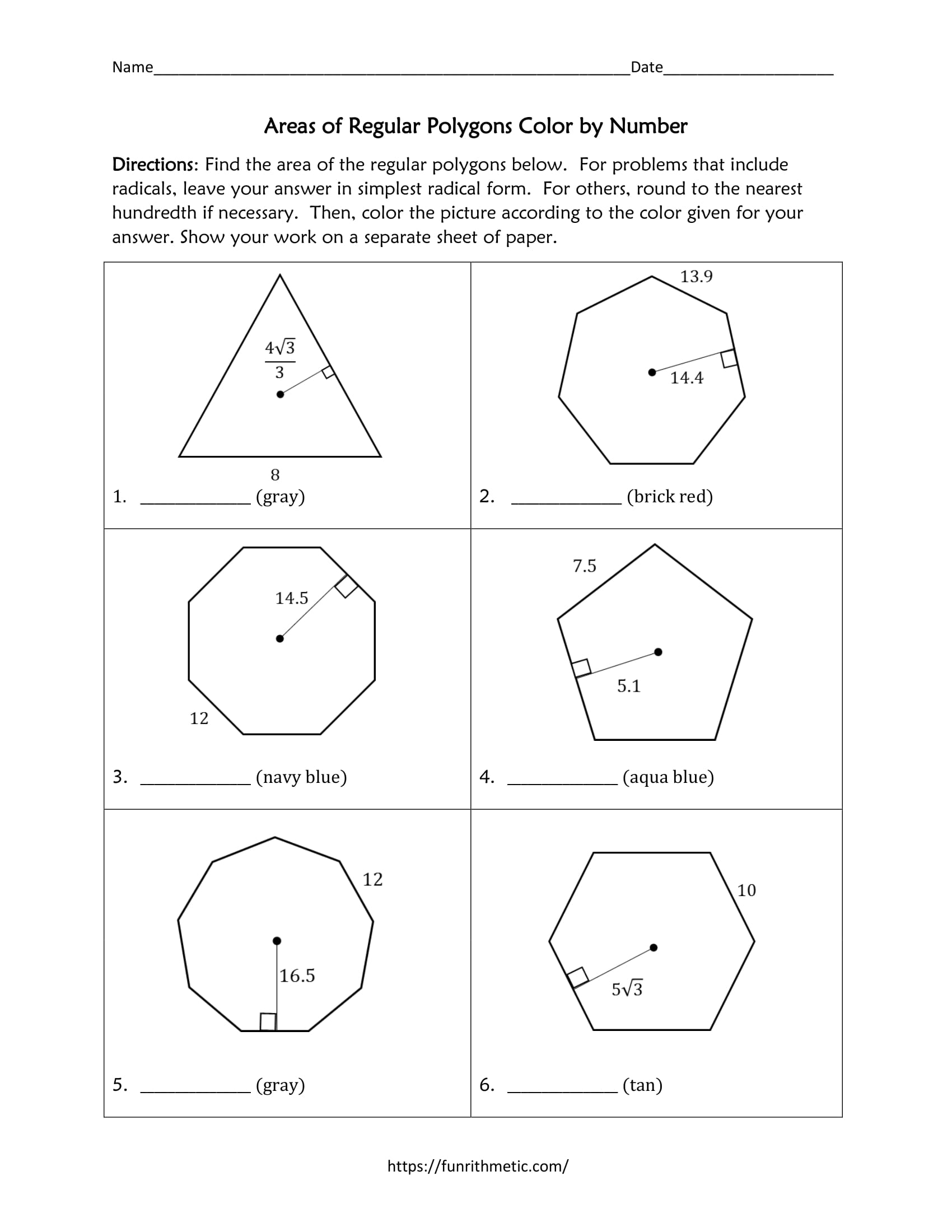 In this activity, students will practice finding the areas of regular polygons–including applying principles of special right triangles–as they have fun coloring! Students will color their answers on the picture with the indicated color in order to reveal a beautiful, colorful pattern!