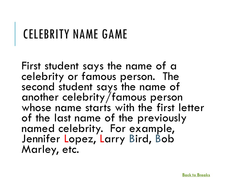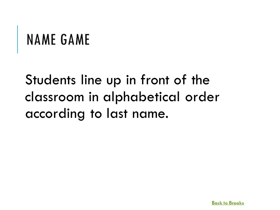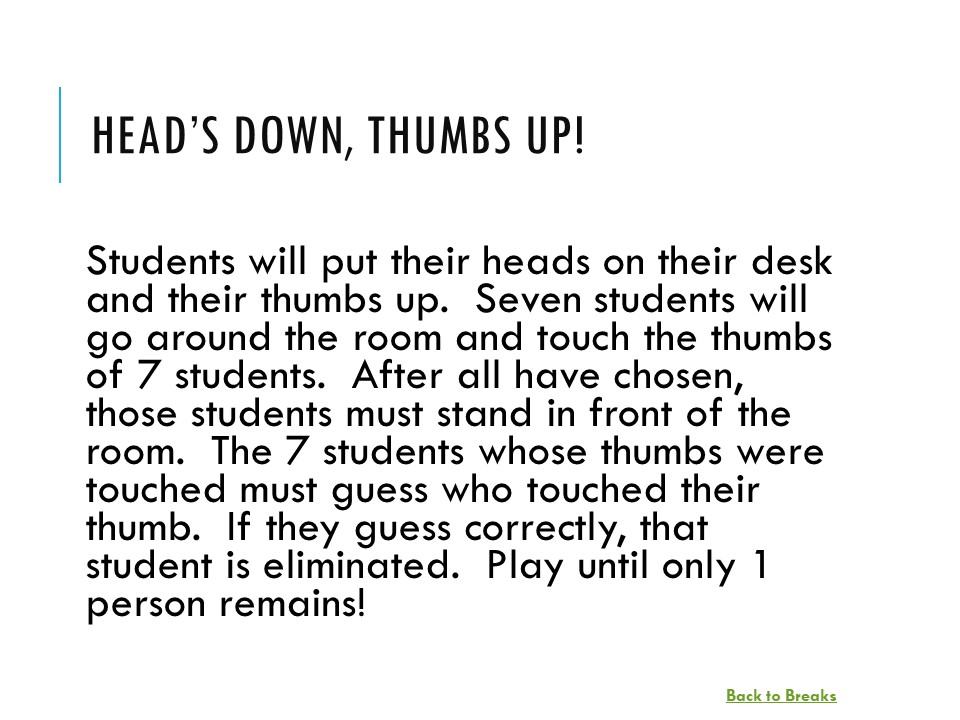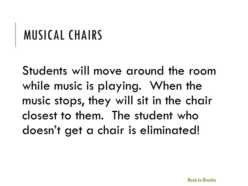 These breaks are great for review days, especially in 90-minute classes. The students can choose the breaks (they are hyperlinked in a PowerPoint presentation) for an added element of intrigue. The breaks come with additional tips and alternatives for use in the notes sections of the slides. Finally, the slides can be easily modified if you prefer to change or tweak the activity.