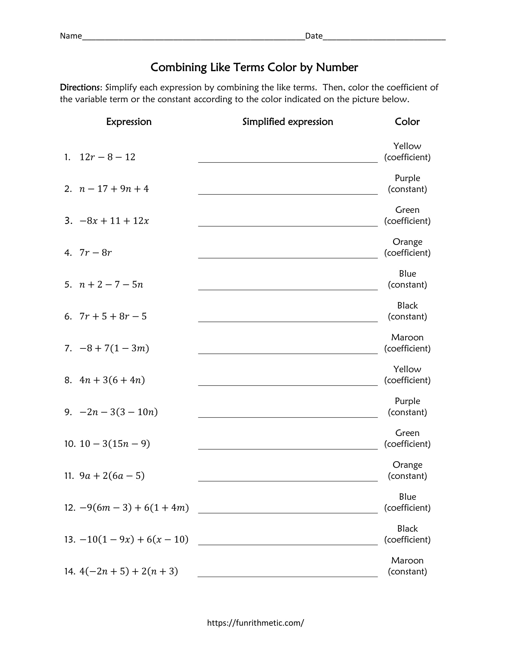 With this activity, students will simplify expressions by combining like terms. They will then identify the coefficient or constant in each simplified expression and color it accordingly to complete a beautiful pattern! As an added bonus, the final product makes fabulous classroom decor!
