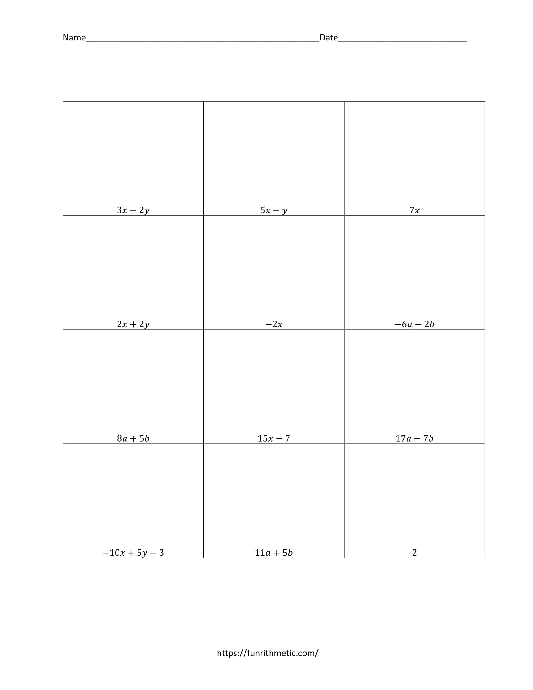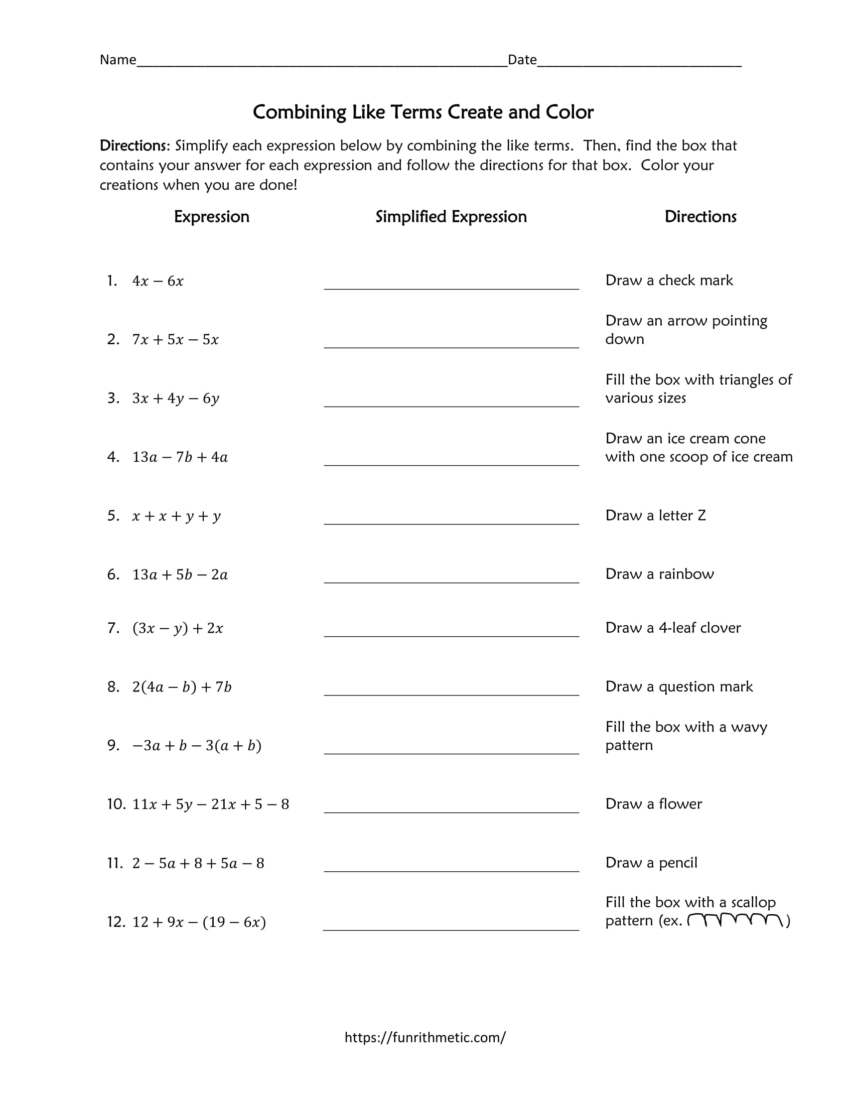 In this activity, students will combine like terms of algebraic expressions as they tap into their creative side! Students will simplify algebraic expressions by combining like terms. Then, they will find their answer in a box on the next page and then decorate that box according to the directions for that exercise. The students will create their own colorful masterpieces as they reinforce their algebra skills, and you will be able to quickly check for understanding as the students assemble their artwork. This flexible activity allows students to stretch their imagination while reinforcing important algebra concepts.