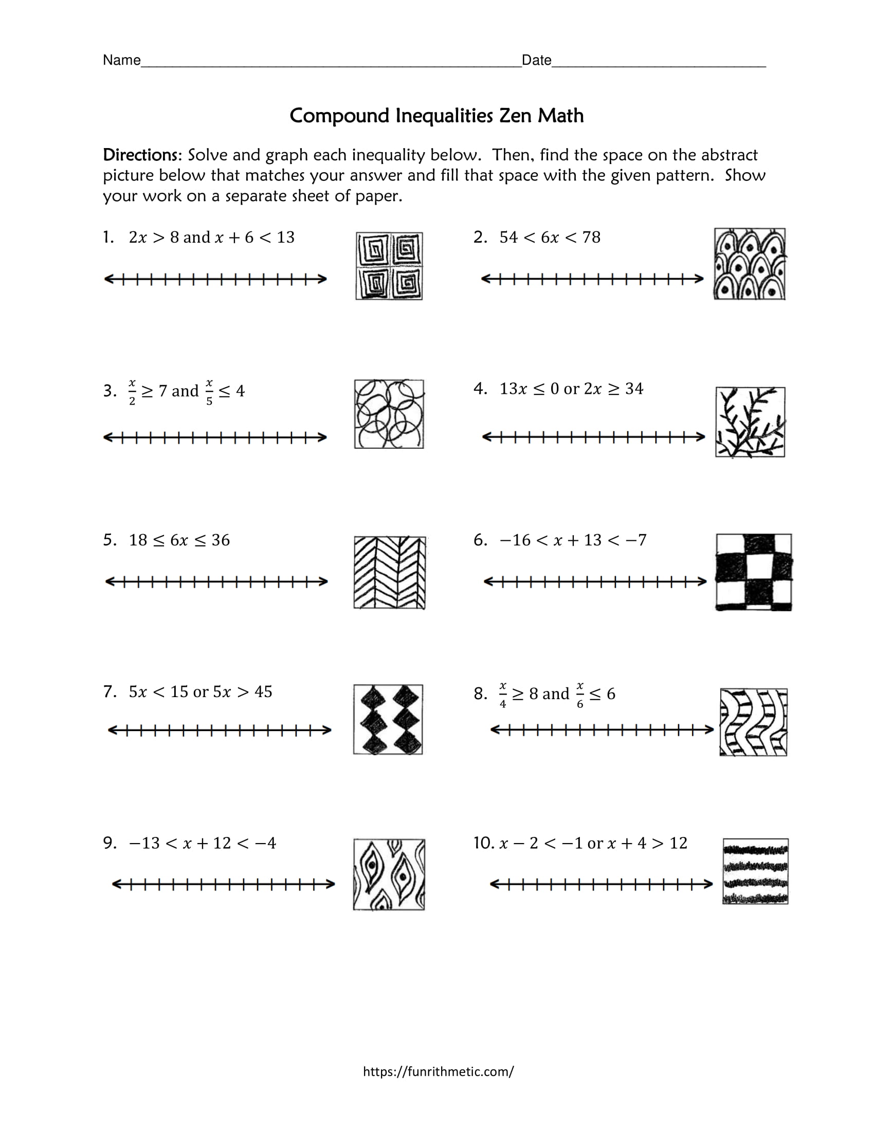 With this no-prep activity, students will solve and graph compound inequalities. Then, they will find their answer on the abstract picture and fill in the space with a given pattern to reveal a beautiful, fun Zen design! Students can color their final products or leave them in black and white. Either way, your classroom will be decorated with beautiful artwork as the students practice their Algebra 2 skills!