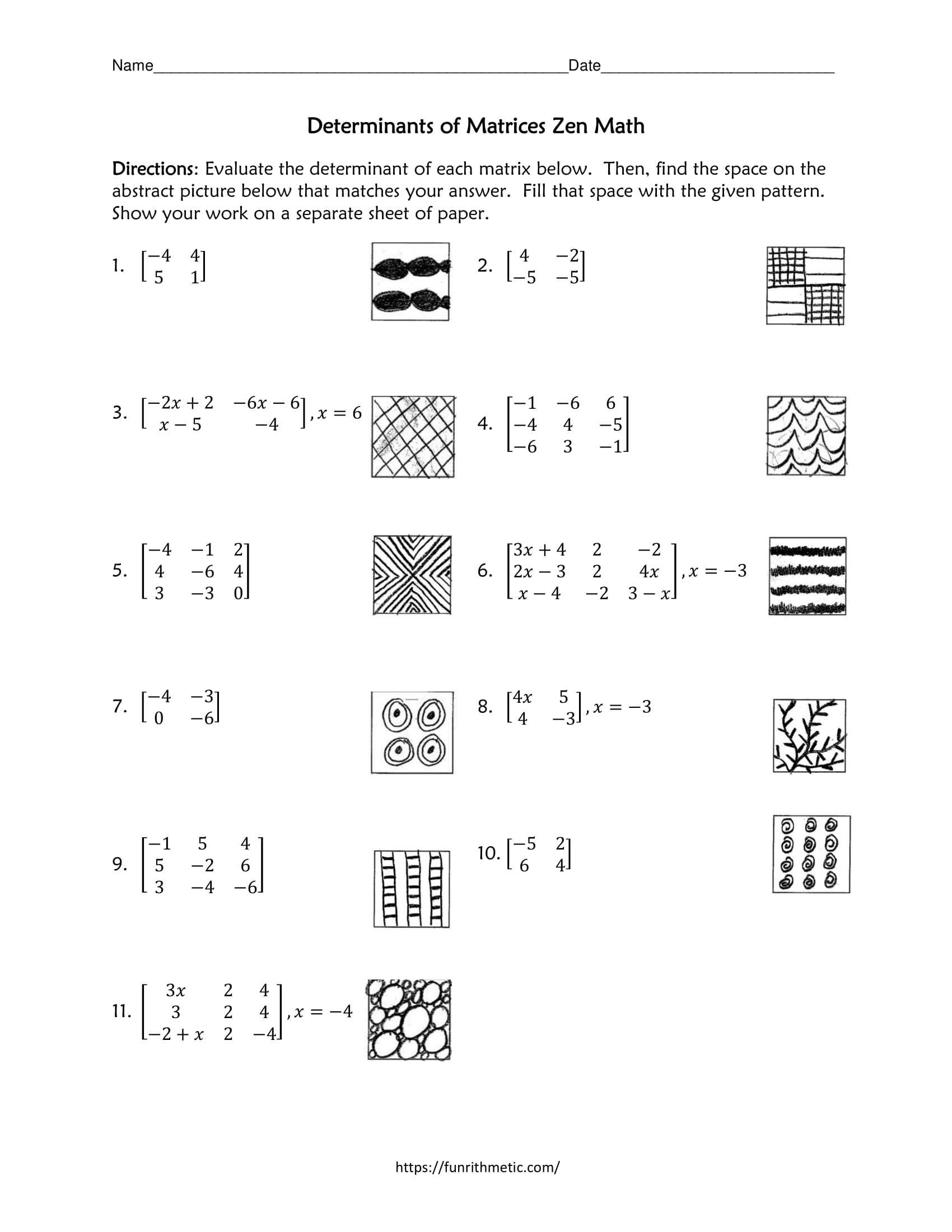With this no-prep activity, students will evaluate the determinant of the given matrices (2 x 2 and 3 x 3, some variables). Then, they will find their answer on the abstract picture and fill in the space with a given pattern to reveal a beautiful, fun Zen design! Students can color their final products or leave them in black and white. Either way, your classroom will be decorated with beautiful artwork as the students practice their Algebra 2 skills!