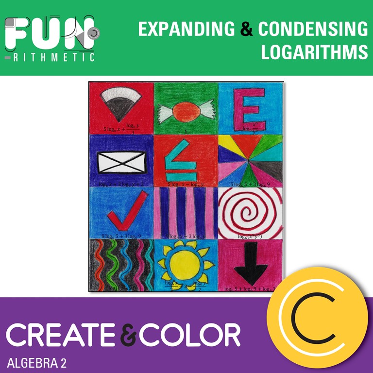 In this activity, students will expand and condense logarithms (same base) as they tap into their creative side! Once students expand or condense the logarithmic expression, they will follow the directions for that box on the next page based on their answer. They will fill the boxes with fun patterns, drawings, and creative ideas! The students will create their own colorful masterpieces as they reinforce their advanced algebra skills, and you will be able to quickly check for understanding as the students assemble their artwork. This flexible activity allows students to stretch their imagination while providing essential skills practice and review.