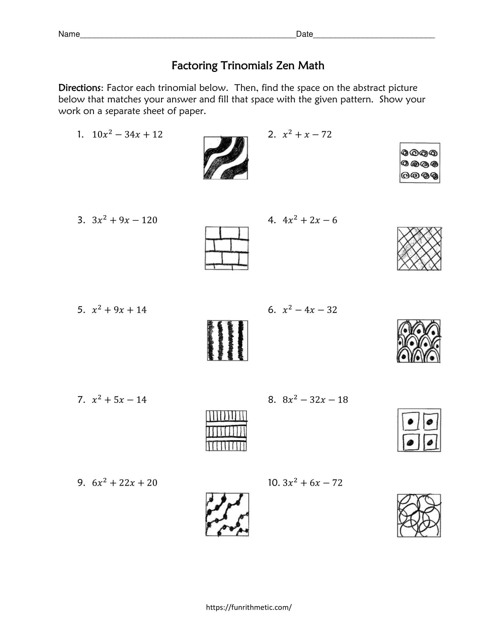 With this no-prep activity, students will practice factoring trinomials (a=1 and a>1). Then, they will find their answer on the abstract picture and fill in the space with a given pattern to reveal a beautiful, fun Zen design! Students can color their final products or leave them in black and white. Either way, your classroom will be decorated with beautiful artwork as the students practice their Algebra skills!