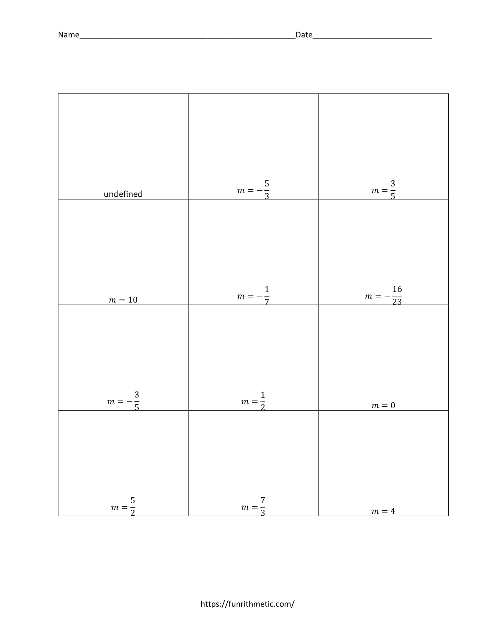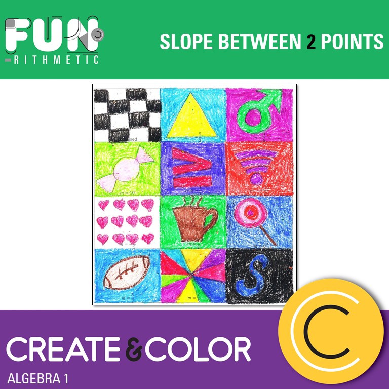 In this activity, students will find slope between 2 given points as they tap into their creative side! Students will use the 2 given points to find slope and then locate their answers in a box on the next page. They will follow the directions for each exercise accordingly and fill the appropriate box with fun patterns, drawings, and creative ideas. The students will create their own colorful masterpieces as they reinforce their algebra skills, and you will be able to quickly check for understanding as the students assemble their artwork. This flexible activity allows students to stretch their imagination while reinforcing important algebra concepts.