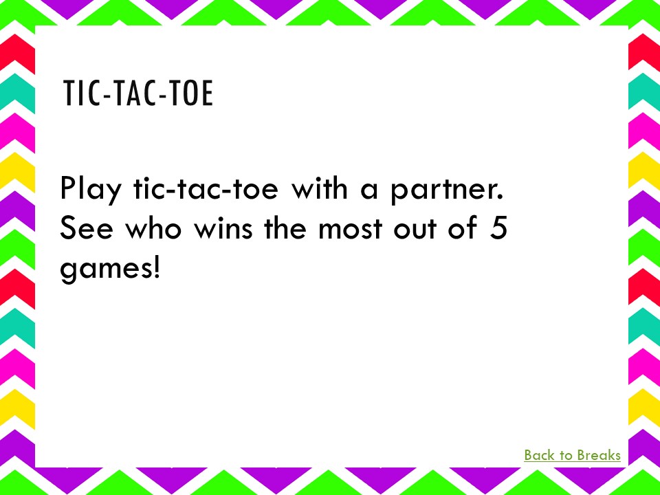 These breaks are great for review days, especially in 90-minute classes. They are no prep and require no downloading of additional apps or software. They work great as ice breakers for the beginning of the year or as time fillers for when you have just a few minutes left of class. The students can choose the breaks (they are hyperlinked in a PowerPoint presentation) for an added element of intrigue. The breaks come with additional tips and alternatives for use in the notes sections of the slides.