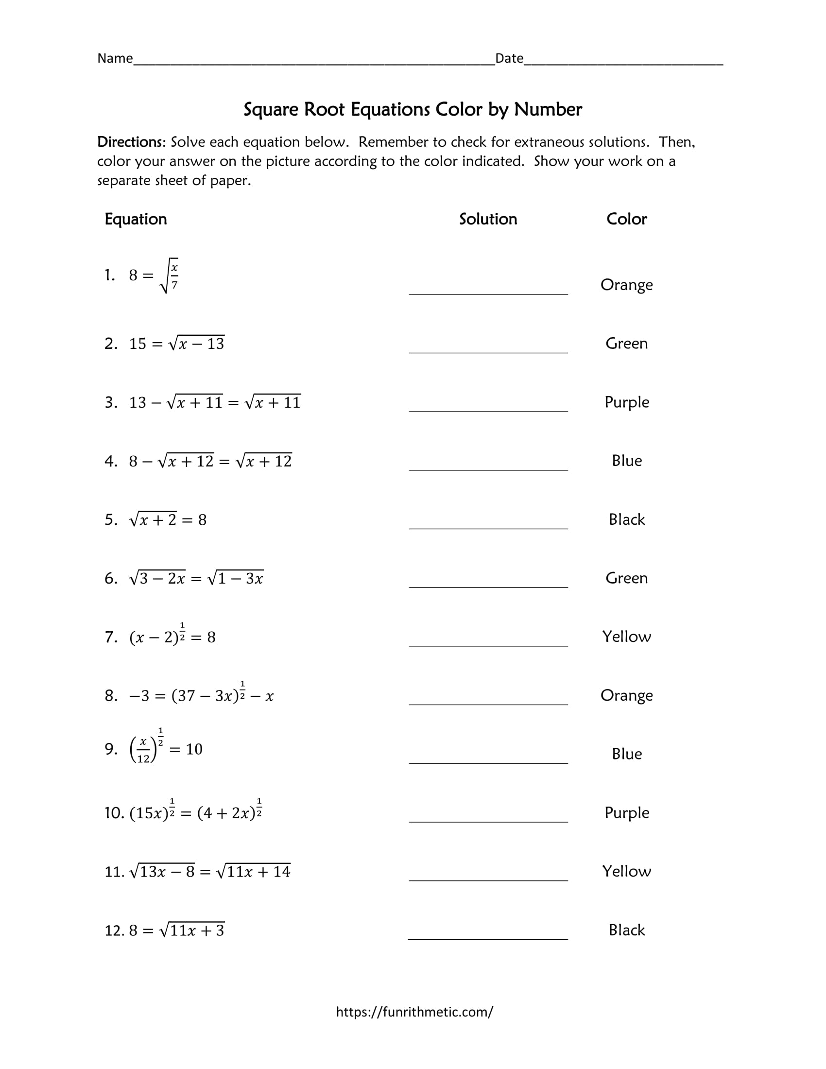 Square Root Equations Color by Number